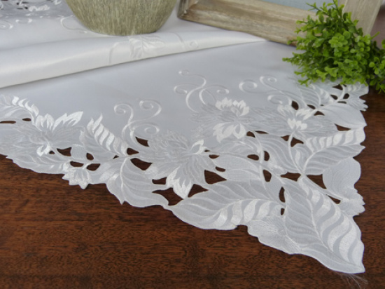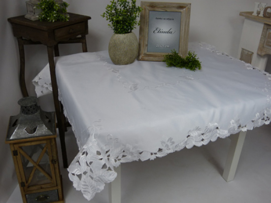 Kolekcja inka, to obrusy wykonane z poliestru, nie sprawiają więc problemów podczas prania i prasowania. Szykowny haft maszynowy elegancko komponuje się z białym kolorem.